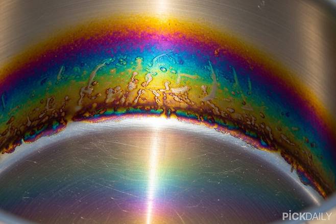 새로 산 스테인리스 냄비나 후라이팬을 쓰다 보면 표면에 무지갯빛 얼룩이 생길 때가 있다.