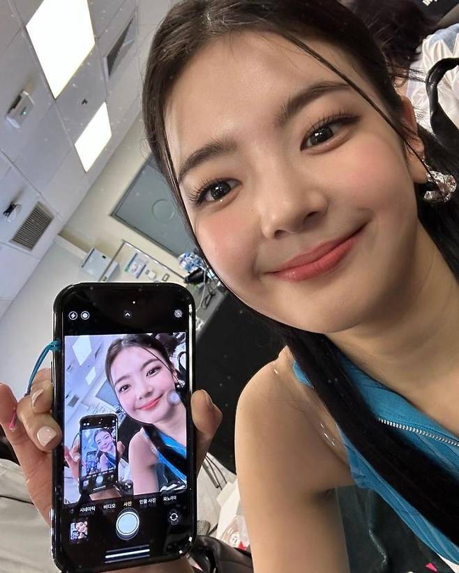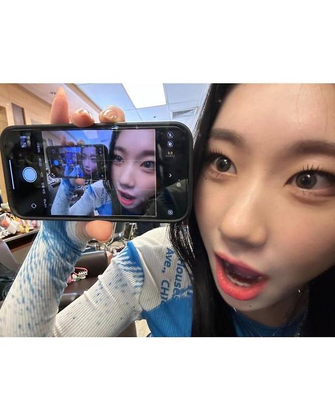 ITZY 멤버 가수 채령은 대기실로 보이는 공간에서 가로로 스마트폰을 눕혀 특이한 표정으로 셀카를 찍어 눈길을 사로잡았습니다.