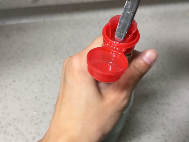 캡을 분리하는 방법은 정말 간단한데요. 숟가락 손잡이 부분을 캡 쪽으로 향하게 두신 후 지렛대의 원리로 당겨서 빼 주시고 플라스틱에 버려주세요.