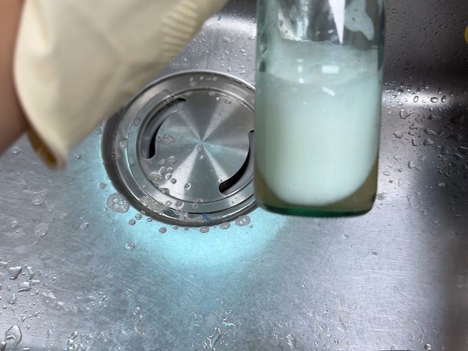 생쌀을 사용했는데도 아직 침전물이 남아있다면 주방세제 1번과 뜨거운 물 100ml를 넣어주도록 하겠습니다. 다시 한번 더 세게 흔들어주시면 기름이 아주 완벽하게 제거가 됩니다.