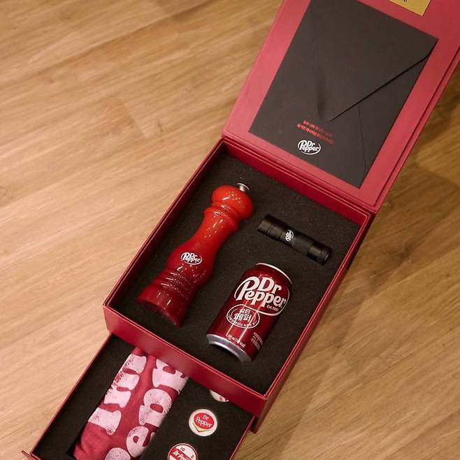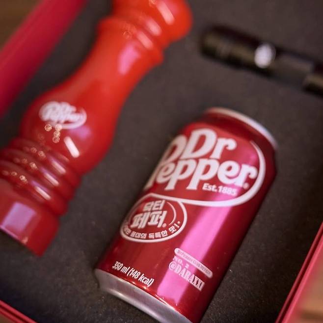 제품 박스, 소금그라인더, 캔, 라이트까지 전부 브랜딩된 키트 속에서, 산다라박은 마치 닥터페퍼 홍보대사처럼 생동감 있는 비주얼을 보여줘요.