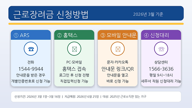 이번 신청은 2025년 귀속 하반기분 근로장려금 반기신청이고, 국세청은 2026년 3월 1일부터 3월 16일까지 신청을 받는다고 안내했습니다.