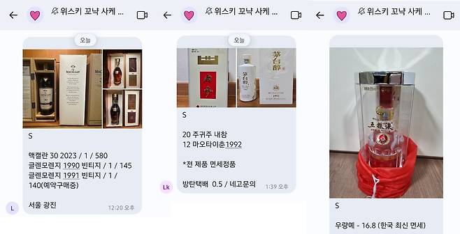 15일 연합뉴스 취재를 종합하면 늦은 밤에도 100여명이 동시 접속하는 이 대화방에는 하루에도 수십 건씩 직거래나 택배로 술을 사고판다는 글이 올라오고 있다. 대중에 잘 알려진 조니워커 블루라벨부터 최고급 중국 백주인 우량예, 수천만원을 호가하는 맥캘란 고급 라인인 파인앤레어까지 종류와 가격대도 천차만별이다.