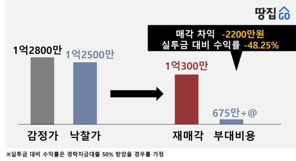 A씨는 가격이 더 떨어질 수 있다고 판단해 손해보더라도 빨리 팔기로 했다. 낙찰받은 지 약 넉달만인 올 3월 1억300만원에 매각했다. 단순 매각 손실만 2300만원. 부대비용까지 더하면 순손실은 3185만원까지 불어난다.