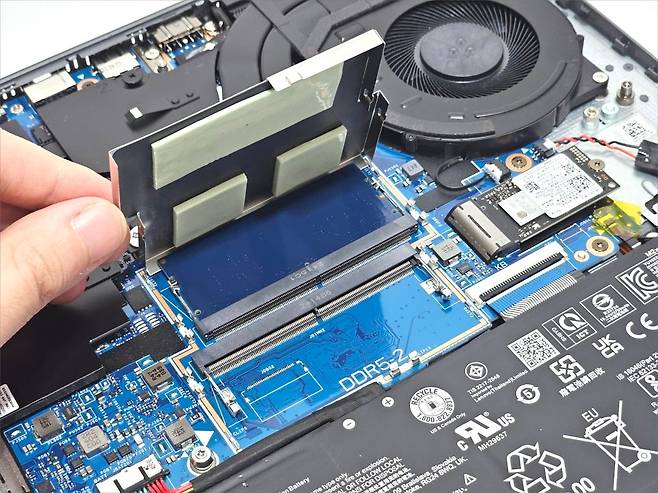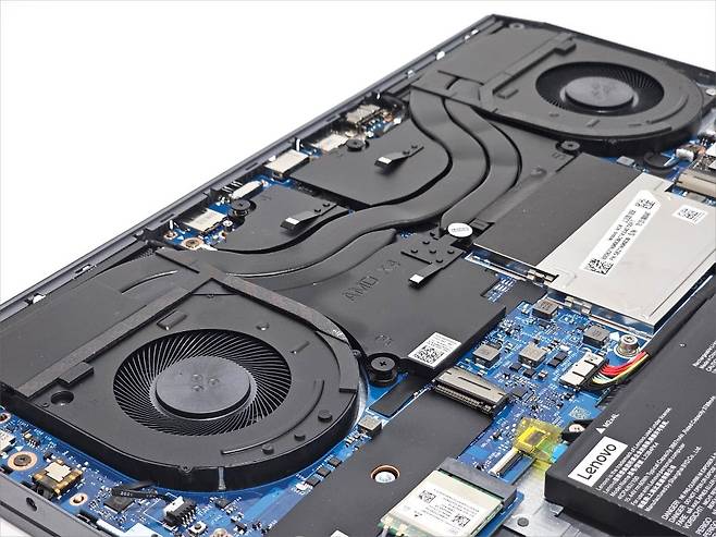 쿨링 시스템은 듀얼 쿨링팬과 듀얼 히트파이프로 구성되어 있으며, 메인보드에는 LPDDR5X 4800MHz 12GB 메모리가 실장되어 있으며, 메모리를 하나 더 장착할 수 있는 추가 메모리 슬롯이 1개 있습니다. 듀얼 채널을 지원하기 때문에 왠만하면, 메모리 추가 구입하여 장착하는 것을 추천드립니다.