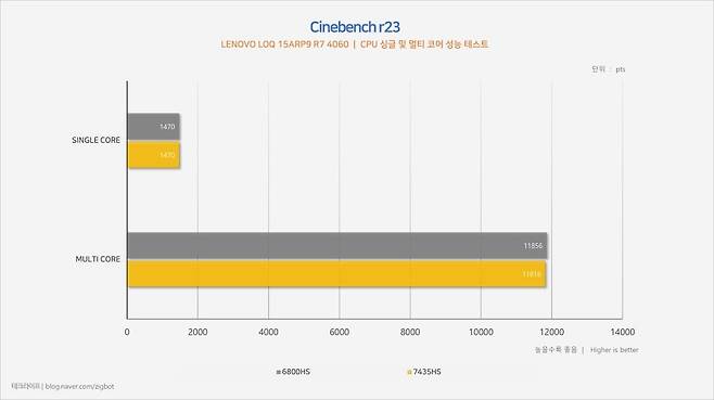 컴퓨터 하드웨어 성능을 평가할 수 있는 대표적인 소프트웨어인 시네벤치(CINEBENCH) 벤치마크 툴로 CPU의 멀티 코어 및 싱글 코어 성능을 측정할 수 있습니다. 측정 결과, 멀티 코어는 11816점, 싱글 코어는 1470점이 측정되어, AMD Ryzen 7 6800HS 프로세서와 거의 차이가 없습니다.