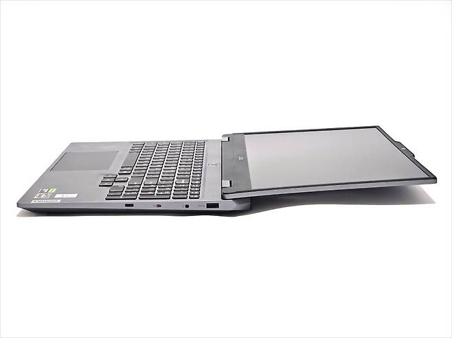 회사에서 제공하는 업무용 노트북도 아닌데 디스플레이 각도 조절 범위는 최대 175도까지 조절이 가능하며, 냉각 성능을 향상시키기 위해서 후면에 별도의 방열구를 마련하여 디스플레이 경첩 구조가 좀 특이하게 구성되어 있습니다.