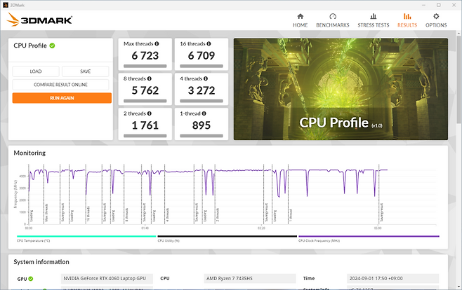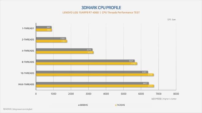 3DMARK의 CPU Profile 벤치마크 결과 입니다. GPU의 워크로드를 최소화하면서 CPU 스레드 수에 따른 성능을 측정할 수 있습니다. AMD Ryzen 7 6800HS와 비교했을 때 소폭 높은 점수가 측정되었습니다.