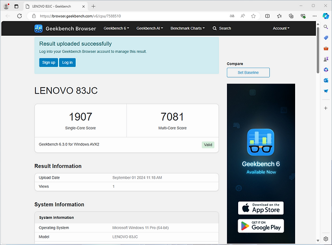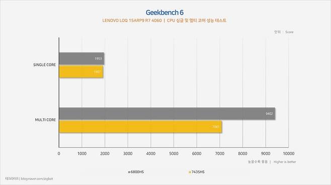 인기 있는 PC 성능 테스트 프로그램 중 하나인 GEEKBENCH 6 벤치마크 결과 입니다. 테스트에 사용된 명령 집합은 'AVX2' 입니다. 테스트 결과, 싱글 코어는 1907점, 멀티 코어는 7081점이 측정되었는데요. AMD Ryzen 7 6800HS 프로세서와 비교했을 때 싱글 코어는 차이가 없었으나 멀티 코어 점수는 꽤나 차이가 났습니다.