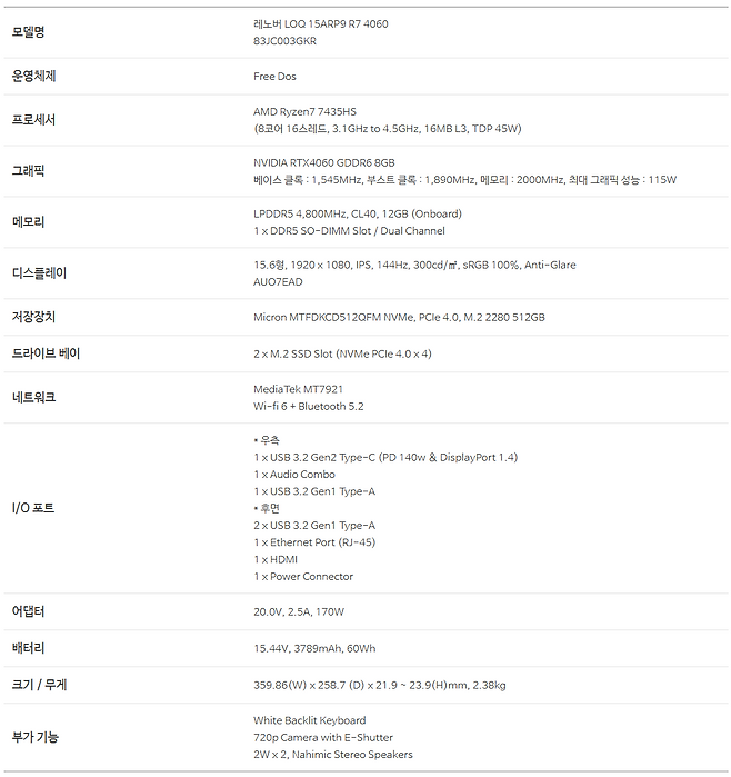 144Hz 고주사율을 지원하는 15.6인치 IPS 디스플레이는 실측시 sRGB 97%, DCI-P3 82%, 300nits 밝기로 손색이 없고, AMD Ryzen 7 6800HS 와 비슷한 성능을 보여주는 7435HS 프로세서가 장착되어 있습니다.