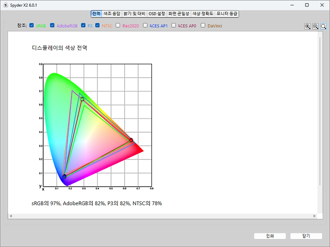 LENOVO LOQ 15ARP9 R7 4060 노트북의 디스플레이의 품질은 어떨까요? 스파이더 X2로 실측시, 색상 전역은 sRGB 97%, AdobeRGB 82%, DCI-P3 82%, NSTC 78% 급으로 우수한 편입니다.