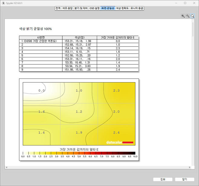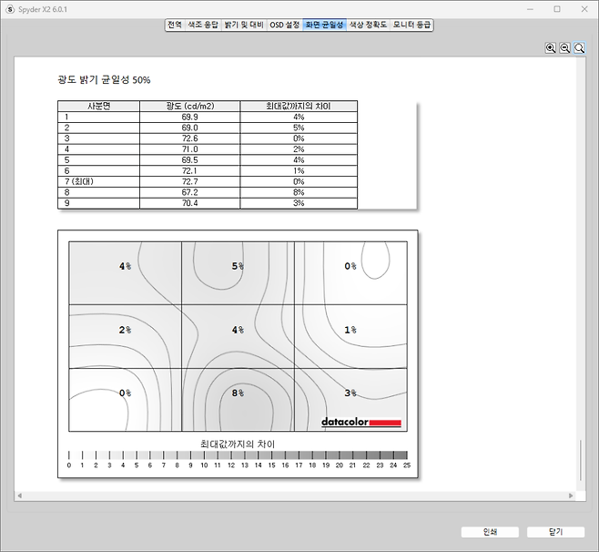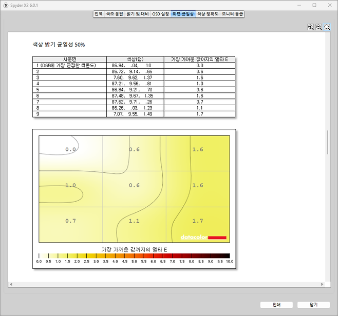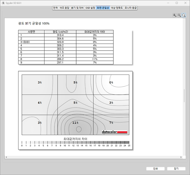 또한, 최대 밝기는 300Nits로 측정되었으며, 색상 정확도는 1.17로 청록색을 제외하고는 대부분의 색상 편차가 적은 편이고, 색상 밝기 균일성도 우수한 편이었습니다. 전체적으로 우수한 품질의 디스플레이가 적용되었다고 생각하시면 됩니다.