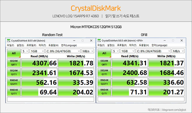 기본 장착된 마이크론의 MTFDKCD512QFM 512GB 저장 장치 성능을 CrystalDiskMark로 측정해봤습니다. 측정 결과, 순차 읽기 속도는 4307.66MB/s, 순차 쓰기 속도는 1821.78MB/s가 측정되었습니다.