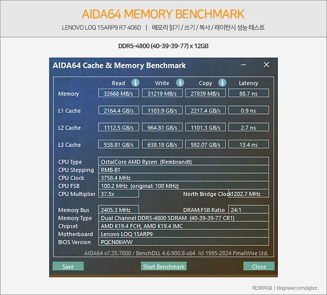 AIDA64 메모리 벤치마크로 읽기, 쓰기, 복사, 레이턴시 벤치마크 결과 입니다. DDR5-4800MHz x 12GB 메모리 1개가 온보드 칩셋 형태로 실장되어 있는데, 듀얼 채널을 지원하기 때문에 왠만하면 메모리를 추가 구입하여 장착하시는 것을 추천드립니다.