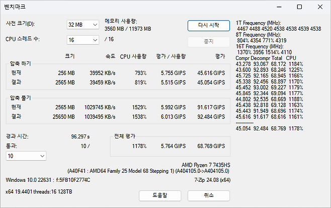 7-Zip은 압축 프로그램으로 널리 알려져있는데요. 벤치마크 툴이 포함되어 있어 CPU 성능에 따른 압축 성능을 측정해볼 수 있습니다. AMD Ryzen 7 6800HS와 비교했을 때 압축 성능은 떨어지지만, 압축 해제시 성능은 소폭 높은 것을 확인할 수 있었습니다.