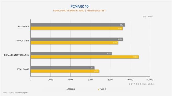 PCMARK 10은 생산성 또는 디지털 컨텐츠 제작과 같은 특정 범주의 작업에서 PC 성능을 측정해볼 수 있는 벤치마크 툴인데요. 사진 편집, 비디오 편집, 렌더링 및 시각화 테스트에서는 7435HS가 더 높게 측정되었으나, 나머지 항목에서는 6800HS 프로세서가 더 높게 측정되었습니다.