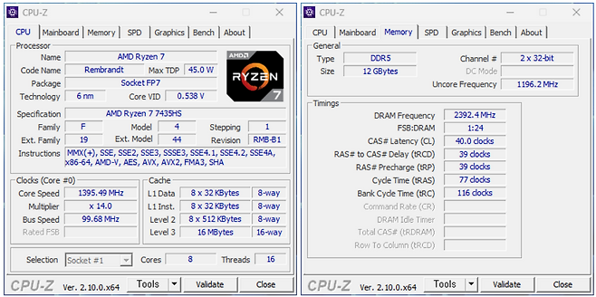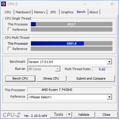 가장 널리 사용되는 CPU 정보 유틸리티인 CPU-Z 입니다. CPU의 싱글 및 멀티 스레드의 성능을 측정할 수 있는데요. 측정 결과, 싱글 스레드는 612.7점, 멀티 스레드는 5881.8점이 측정되어 AMD Ryzen 7 6800HS 프로세서와 거의 비슷한 성능을 보여주고 있습니다.