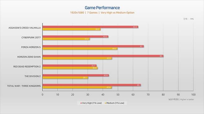 7종 게임 성능은 어떨까요? 1920x1080 해상도에서 제일 높음 옵션과 중간 옵션에서의 성능 차이를 비교해봤습니다. 사이버펑크 2077, 레드 데드 리뎀션2를 제외하고 최고 옵션에서 대부분 평균 60 프레임이 플레이가 가능했으며, 중간 옵션에서는 90프레임 이상 플레이가 가능했습니다. 결과적으로, FHD 해상도에서 옵션 타협 없이 AAA급 게임을 충분히 즐길 만한 성능이 되는 제품이라고 할 수 있겠습니다.