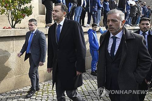 epa11902866 Prime-minister of Portugal Luis Montenegro (C) and the Minister for Parliamentary Affairs Pedro Duarte (R) arrive to pay his respects to FC Porto president Jorge Nuno Pinto da Costa at Antas church following his funeral in Porto, Portugal, 17 February 2025. Jorge Nuno Pinto da Costa, former president of FC Porto, died on 15 February at the age of 87. EPA/FERNANDO VELUDO