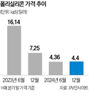 이 때문에 폴리실리콘 가격은 1년 전 ㎏당 7.2달러에서 지난 30일 4.4달러로 38% 하락했다.