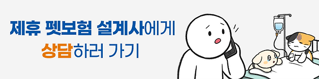 그렇기에 펫보험 종류를 알아보고, 가입할 펫보험을 알아볼 때에는 전문 설계사와 상담하시는 것을 추천드리는 바인데요. 펫보험 전문 설계사와 상담을 통해 펫보험을 가입한다면, 우리 아이에게 더 적합하고 보장을 잘 받을 수 있는 보험을 선택할 수 있다는 장점이 있습니다. 또한 보호자의 시간적 노력도 절감할 수 있어요. 상담부터 보험 설계, 청구 대행까지 제공하니 반려동물 보호자 입장에서는 어렵지 않게 펫보험 가입을 진행할 수 있겠죠? 아래 배너를 통해 제휴 펫보험 설계사에게 상담을 받아보세요.