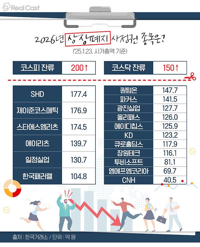 코스닥에서는 11개 종목이 상장유지기준(시총 150억 원) 미만입니다. CNH(41억원)를 시작으로 엠에프엠코리아(70억원), 투비소프트(81억원), 장원테크(116억원), 큐로홀딩스(118억원), KD(123억원), 에이디칩스(126억원), 올리패스(126억원), 광진실업(128억원), 파커스(141억원), 퀀텀온(148억원)이 차례로 뒤를 이었습니다.