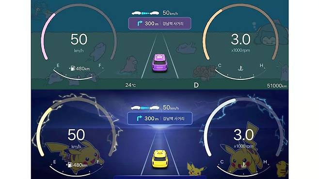 현대차는 지난 2월 말 블루링크 스토어를 통해 ‘포켓몬 디스플레이 테마’를 29,900원에 출시했다. 피카츄와 메타몽 캐릭터를 활용해 내비게이션 화면과 클러스터(계기판)를 포켓몬 스타일로 바꿔주는 유료 콘텐츠다. 신호 대기 중 피카츄 인사 모션, 드라이브 모드 변경 시 계기판 연동 등 세밀한 연출로 출시 직후 화제를 모았다.