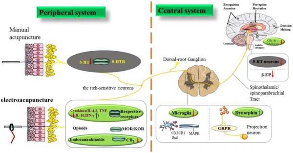 가려움은 긁는 행위나 통증을 주는 자극을 통해서 억제될 수 있고, 반대로 억제된 통증은 가려움을 유발할 수 있다. 침치료는 이러한 신경전달 경로에 작용하기에 가려움증 해소에 많은 도움이 된다.
