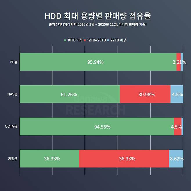 이제 남은 화두는 용량이다. 다나와 리서치 데이터는 HDD 용량의 명확한 양극화를 보여준다. PC용 HDD는 10TB 이하 제품이 95.94%로 절대 다수를 차지한다. 개인 사용자가 단순 저장용으로 10TB 이상 고용량을 선택하는 경우가 드물기 때문이다. NAS용 역시 개인 및 SOHO 비중이 높아, 10TB 이하 제품이 시장의 주류를 형성한다. 그러나 기업용 HDD는 체급 자체가 다르다. 12~20TB급 제품이 가장 많이 사용되며, 22TB 이상 초고용량 제품도 8.62%나 차지한다. AI가 학습하고 저장해야 할 데이터 규모가 기하급수적으로 증가하면서, 더 많은 용량을 담을 수 있는 HDD의 필요성이 높아졌기 때문이다.