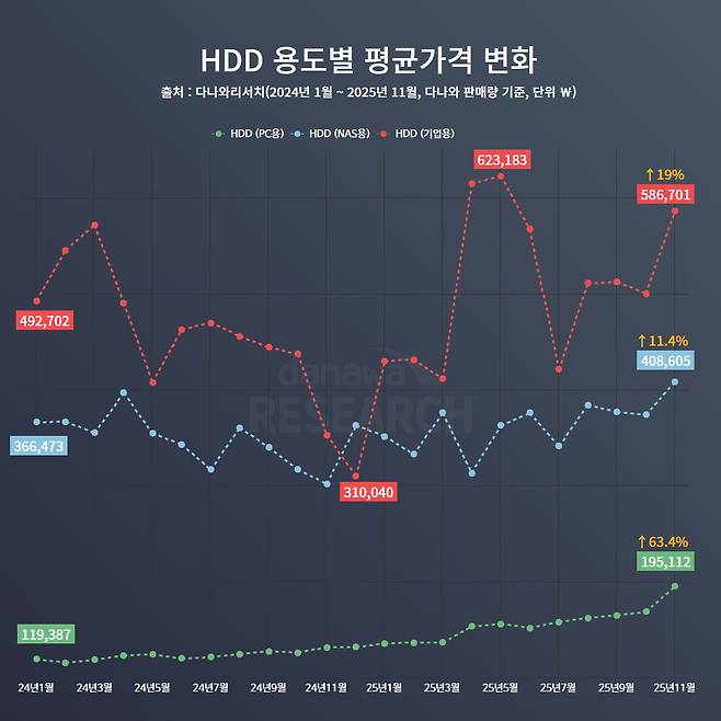 가장 기본적인 경제 원칙인 수요–공급 법칙에 따르면, 수요가 폭증하면 가격이 오르는 것이 당연한 일이다. 시장조사업체 트렌드포스의 보고서에서도 이를 확인할 수 있다. 2024년 2분기 기준 HDD 전체 평균 가격이 이미 10~20%가량 상승했다는 것이다. AI 아키텍처 구축이 증가함에 따라 HDD 수요가 늘어난 결과다. 다나와 리서치 데이터를 보면 상승 폭은 이보다 더 가파르다.