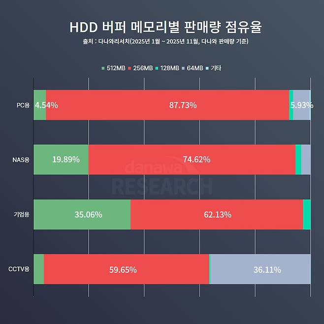 기업용 고용량 제품이 시장을 주도하면서 전반적인 스펙의 상향 평준화도 두드러진다. 특히 버퍼 메모리 용량 변화가 뚜렷하다. PC용 HDD의 경우 256MB 버퍼 제품이 87.3%로 절대 다수를 차지하고, 512MB 제품은 4.54%에 불과하다. NAS용 역시 512MB 제품의 비중은 19.89% 수준에 머문다. 고속 연산보다는 단순 녹화가 주력인 CCTV용은 여전히 64MB 버퍼 제품이 36.11%로 판매량 점유율이 가장 높다.