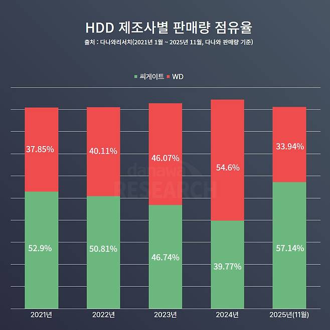 곧 다가올 2026년, AI 아키텍처 경쟁이 더욱 심화되면서 이 제조사별 점유율 그래프는 다시 한 번 크게 요동칠 가능성이 높다. HDD 시장의 주도권을 둘러싼 두 거인의 싸움이 이제 2막으로 접어든 셈이다.