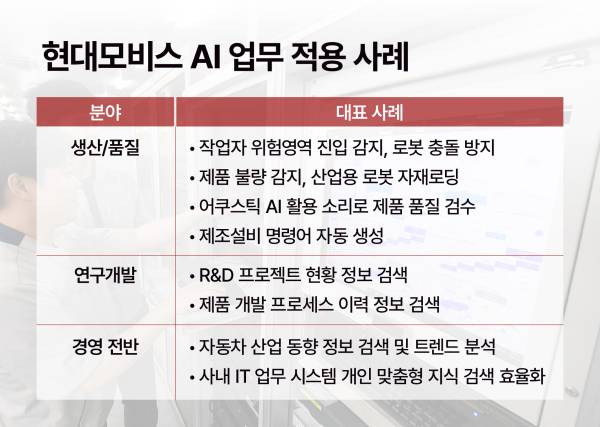 한편 현대모비스는 국내 사업장에 작업자의 위험영역 진입을 감지하고 로봇과 충돌을 방지하는 안전감지 AI 모델을 도입한 바 있으며, 인공지능이 소리를 인식해 제품의 품질 정확도를 판단하는 ‘어쿠스틱 AI 시스템’도 개발해 생산 현장에 적용 중이다. 현대모비스는 최근 잇따른 AI 분야 기술 성과를 바탕으로 국내외 생산 및 연구개발 거점에 확대 적용해 전사 차원의 AI 기반 경영 혁신을 강화할 방침이다.