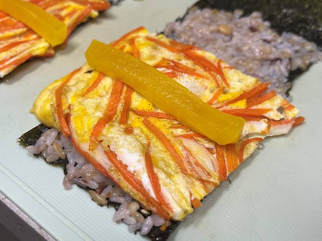 김밥은 반을 잘라서 사용했고, 끝부분 약간만 남기고 밥을 얇게 깔아주세요.