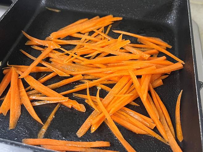당근, 크래미, 계란, 단무지만 있으면 일반 김밥 못지않은 맛을 낼 수 있습니다. 당근은 채 썰어서 기름 두르고 볶아 주세요. 거의 익으면 크래미를 조금 넣고 같이 볶습니다.