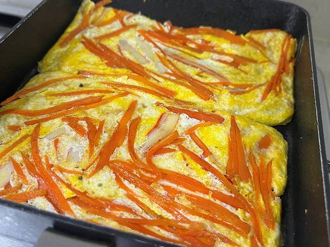 계란 2개를 풀어서 팬에 붓습니다. 그럼 이렇게 당근과 크래미가 들어가 계란 지단이 완성돼요.