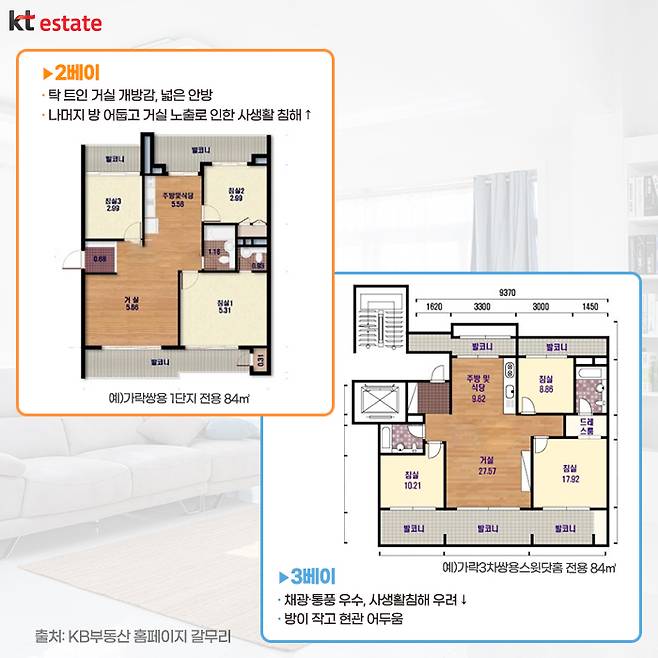 우선 2베이입니다. 2베이는 전면 발코니를 기준으로 거실과 방(주로 안방)이 각각 1개씩 배치된 구조입니다. 현관이 거실 쪽에 배치돼 있어 집에 들어서면 거실이 한눈에 들어와 개방감이 좋고 안방이 넓습니다. 그러나 전면 발코니 반대편에 위치해 있는 나머지 방은 상대적으로 어두울 수 있고, 거실과 주방 공간의 경계가 불분명하다는 점이 단점으로 꼽힙니다. 또한, 현관에서 거실이 바로 노출돼 사생활이 침해될 수 있다는 부분도 있습니다.