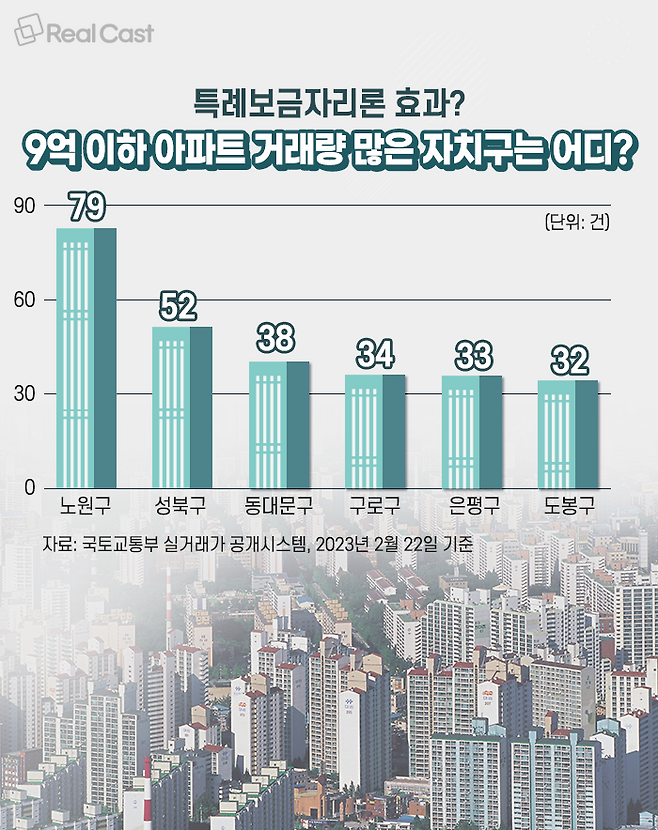 한 가지 주목해야 할 것은 중저가 아파트 비중이 낮은 자치구의 거래가 늘어난 점입니다. 업계에서는 특례보금자리론 출시 당시, 9억원 이하의 중저가 아파트가 많은 ‘노·도·강’ 위주로 매수심리가 우선적으로 회복할 것으로 예측했는데요. 하지만 자치구별 9억 이하 아파트 거래량을 살펴보면, 노원구가 79건으로 가장 많았으며, 성북구 52건, 동대문구 38건, 구로구 34건, 은평구 33건 등이 뒤를 이었습니다. 이는 노원구를 제외하면 다소 의외의 결과라고 볼 수 있죠.