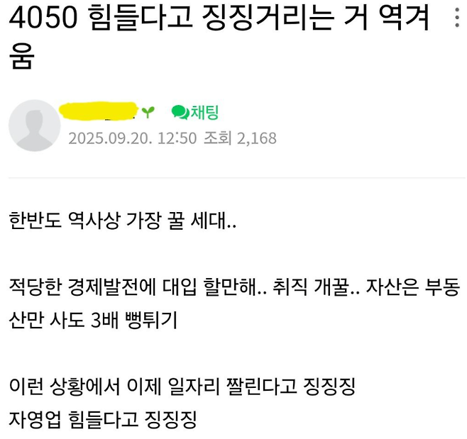 결국 이 갈등의 해결책은 서로의 경험과 처지를 인정하는 데서 출발해야 한다. 영포티 세대의 고난과 희생은 존중받아야 하고, MZ세대의 권리 의식과 개선 노력 또한 가치 있는 것이다. 중요한 것은 서로 다른 시대를 살아온 두 세대가 각자의 강점을 인정하고, 더 나은 사회를 만들어가는 동반자가 되는 것이다. 세대 갈등이 아닌 세대 연대를 통해서만 우리 사회의 진정한 발전이 가능할 것이다.