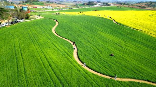 고창의 보리나라 학원농장은 매년 4월 말에서 5월 중순까지 드넓은 평야에 청보리와 유채꽃이 가득합니다. 인기 드라마 '도깨비'의 촬영장소로 알려진 학원농장에는 평야 한가운데 고고히 서있는 아름드리 나무가 신비로운 분위기를 형성하는데요.