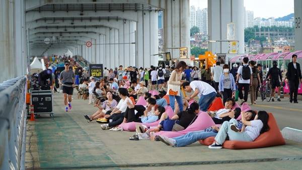 차량이 오가던 거리에는 빈백이 설치되어 한강을 조망하며 여유로운 시간을 즐길 수 있는데요. 도로 양 옆으로 플리마켓과 먹거리 부스, 체험 부스 등 다양한 부스가 설치되어 보다 다양한 놀거리를 제공합니다.