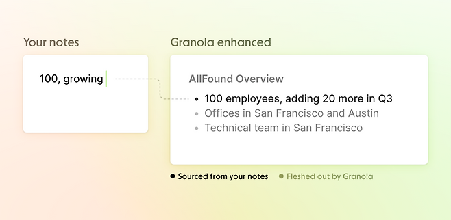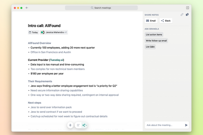그래놀라 측은 "챗GPT는 몇 초 만에 메일을 쓸 수 있다. 그러나 제대로 된 이메일을 쓰게 하려면 몇 차례나 수정해야 한다"라며 "AI 회의 요약 분야도 그렇다. AI가 요점을 알아야 최상의 노트를 쓴다"라고 밝혔다.