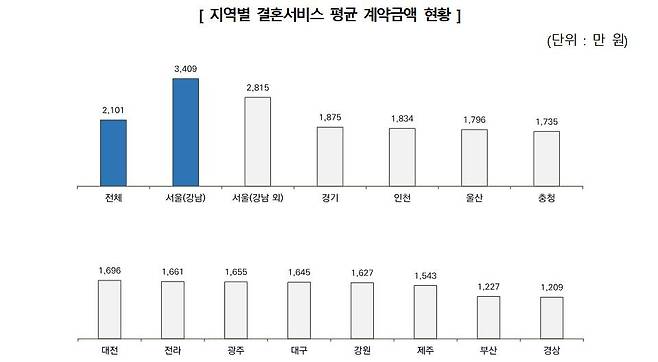 전국에서 결혼식을 치르는 데 드는 서비스 비용이 평균 2천101만원으로 조사됐다. 결혼 비용은 서울 강남이 3천409만원으로 경상도의 세 배에 육박한다.