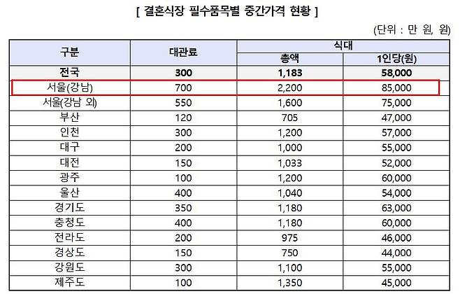 1인당 식대와 결혼식장이 요구하는 최소 보증 인원을 곱한 비용의 중간 가격은 1천183만원이다. 지역별로는 서울 강남(2천200만원)이 최고가, 부산(705만원)이 최저가로 각각 나타났다.