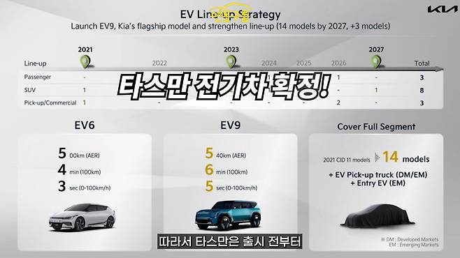 기아 관계자에 따르면 타스만의 순수 전기차(EV) 모델은 이미 확정된 상태다. 이는 기아가 공식 행사 'EV Day'를 통해 수년 전부터 공개했던 내용이며, 상표권 등록 자료와 투자자 설명회 자료에서도 14개의 EV 모델 출시 계획 중 EV 트럭이 명확히 포함되어 있다.