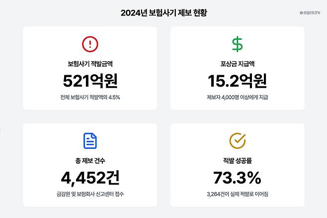 금융감독원이 2024년 한 해 동안 보험사기 제보를 통해 521억 원 규모의 보험사기를 적발하고, 제보자들에게 총 15억 2천만 원의 포상금을 지급한 것으로 알려졌다.