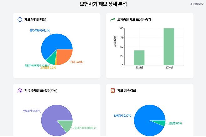 제보 내용으로는 음주·무면허 운전(62.4%), 운전자 바꿔치기(10.5%), 고의 충돌(2.2%) 등 자동차보험 관련 제보가 가장 높은 비중을 차지했다.