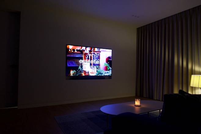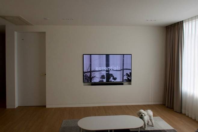벽을 새로 만들면서 TV 사이즈에 딱 맞게끔 공간을 파서 벽걸이 TV를 매립 시켜버렸어요. 결혼 선물로 받은 사운드 바도 함께 매립해서 설치해 버리니 너무 깔끔해졌습니다!