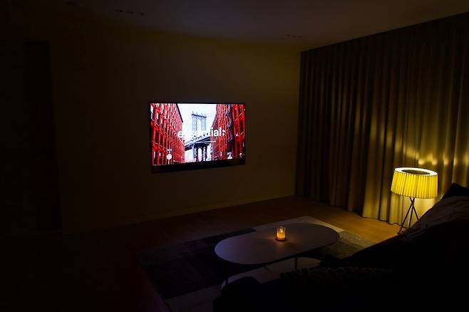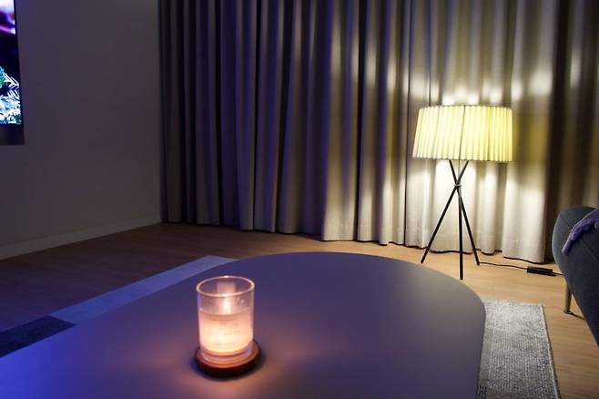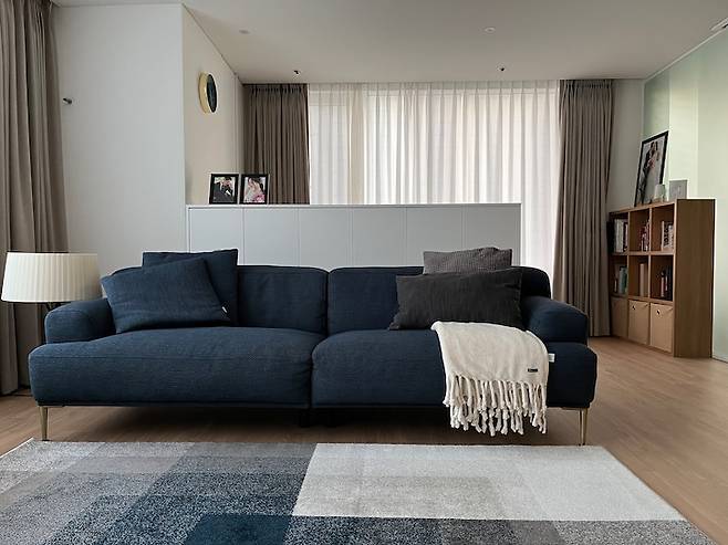 소파 맞은편에는 가벽을 세워 공간을 좀 더 아늑하게 만들었습니다. 기존에 있었던 차가운 느낌의 유리도어를 깔끔한 화이트 도어와 벽으로 가려주었어요. 거실에선 주로 남편과 넷플릭스를 보며 하루를 마무리하거나, 노래를 들으며 휴식을 취해요.