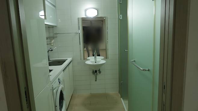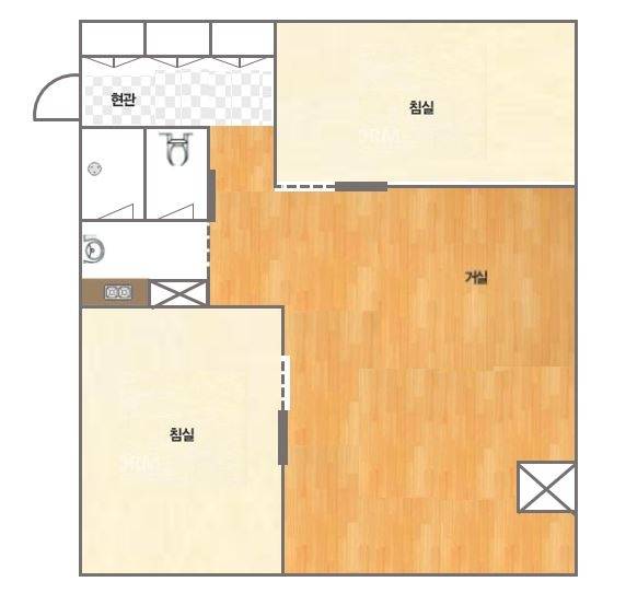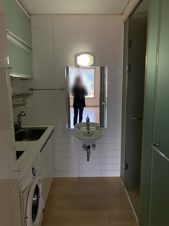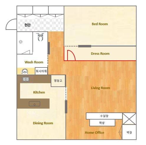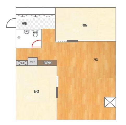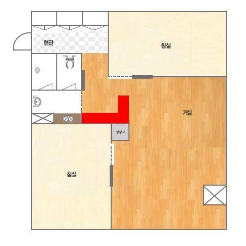 2. 기존 싱크대 위치 유지, 화장실 유리도어를 철거하고 가벽을 세워 도어를 만든다